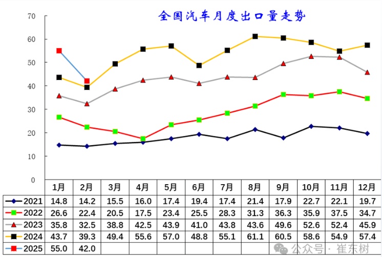智通财经APP获悉,3月24日,崔东树发布2025年1-2月中国汽车出口市场分析。2025年2月中国汽车实现出口42万台,同比增7%,同、环比走势总体一般;1-2月中国汽车实现出口97万台,同比2024年1-2月增速17%。