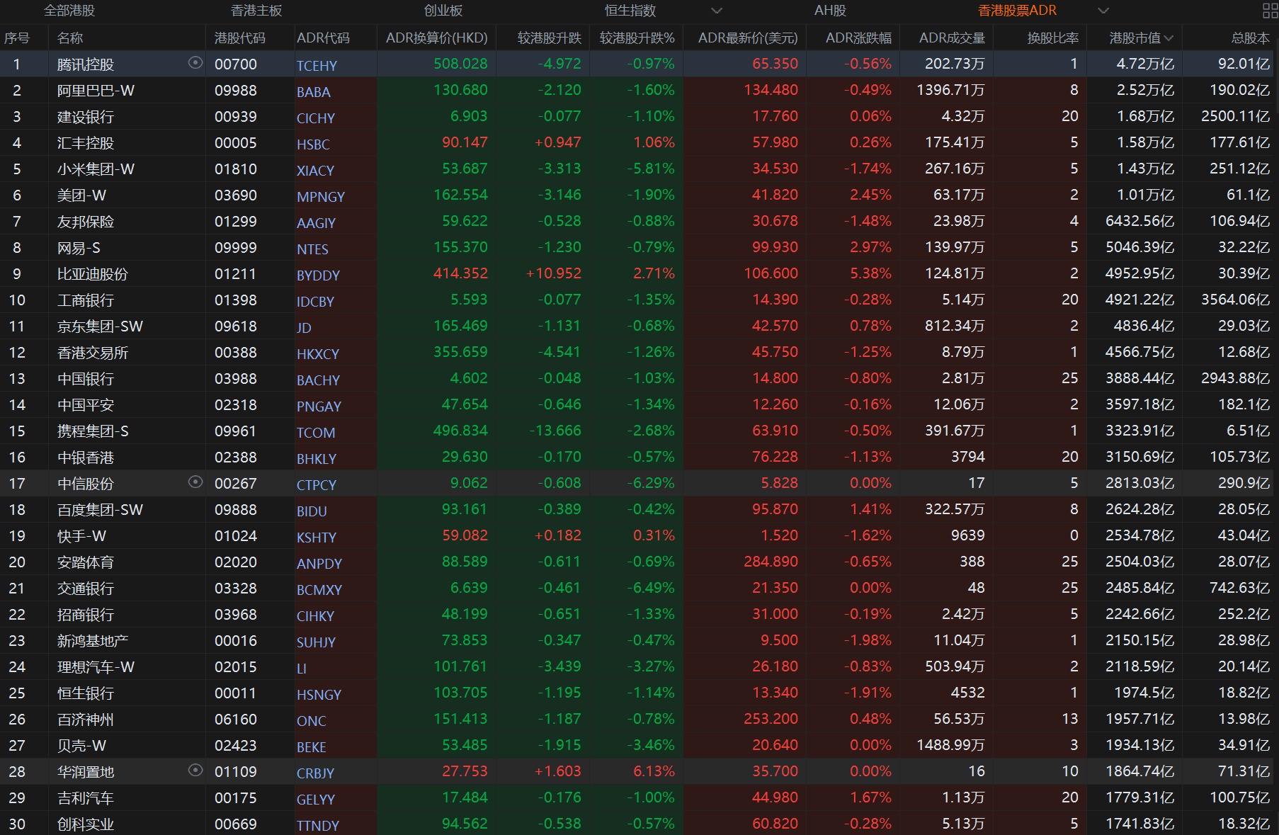 智通财经APP获悉,周一美股三大股指悉数上涨,恒生指数ADR下跌,按比例计算,收报23666.92,较香港收市下跌238.64点或1%。