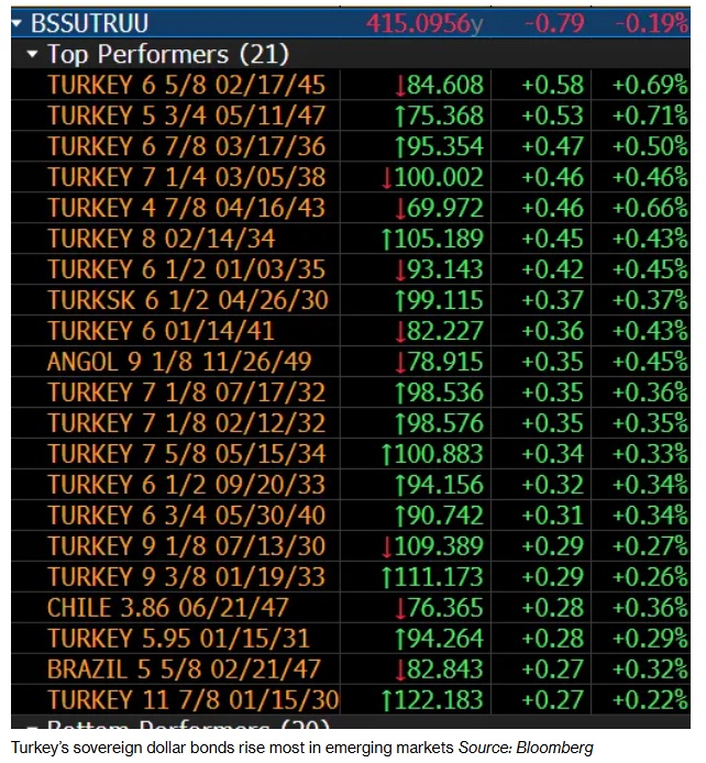 智通财经APP获悉,土耳其主权美元债券在新兴市场债券中涨幅最大,由于投资者越来越预期该国政治动荡不会影响其经济政策轨迹,其信用风险有所改善。