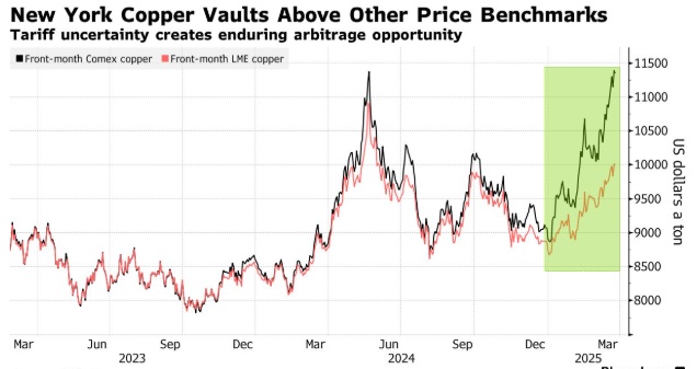 近月铜期货合约今年已经上涨了29%,美国价格和伦敦金属交易所(LME)设定的全球基准价格之间造成了前所未有的脱节。今年1月,美国铜期货价格开始飙升,高于LME铜价,在特朗普上月下令美国商务部以国家安全为由对可能征收的铜关税进行调查后,这一差距扩大至创纪录水平。周一,Comex和LME近月合约价差达到每吨逾1400美元的历史高位。