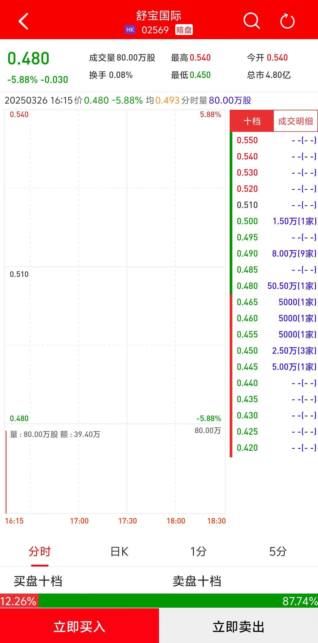 智通财经APP获悉,舒宝国际(02569)将于3月27日(星期四)在香港挂牌。截至发稿,利弗莫尔证券暗盘交易显示报价0.48港元,较招股价0.51港元下跌5.88%,每手5000股,不计手续费,每手亏150港元。