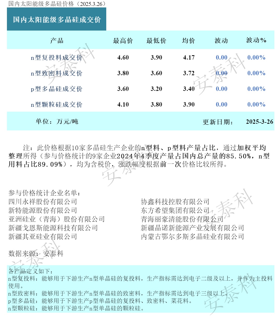 智通财经APP获悉,硅业分会发文称,本周多晶硅价格维持稳定。n型复投料成交价格区间为3.90-4.60万元/吨,成交均价为4.17万元/吨,n型颗粒硅成交价格区间为3.80-4.10万元/吨,成交均价为3.90万元/吨,p型多晶硅成交价格区间为3.20-3.60万元/吨,成交均价为3.40万元/吨。