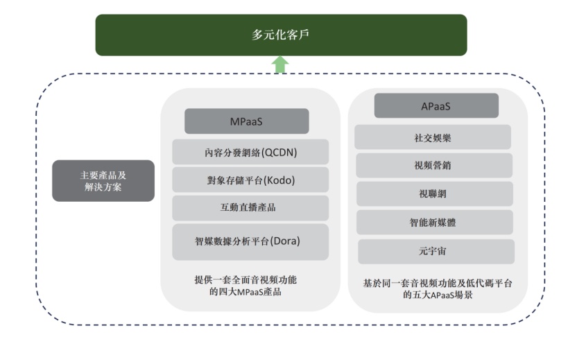 其中,MPaaS即一系列音视频解决方案,覆盖音视频业务链的各个环节,包括音视频的存储(比如对象存储平台Kodo)、内容分发(专有内容分发网络QCDN)、直播互动、数据分析(智媒数据分析平台Dora)等。