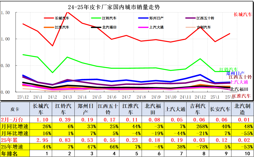 2025年皮卡市场主力厂商表现较好,长城汽车保持较强的绝对优势地位,上汽大通和长安汽车2月国外出口市场表现很强,江淮汽车和江铃汽车2月走势较强,北汽福田和郑州日产等保持强势国内主力地位。