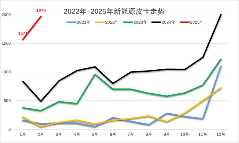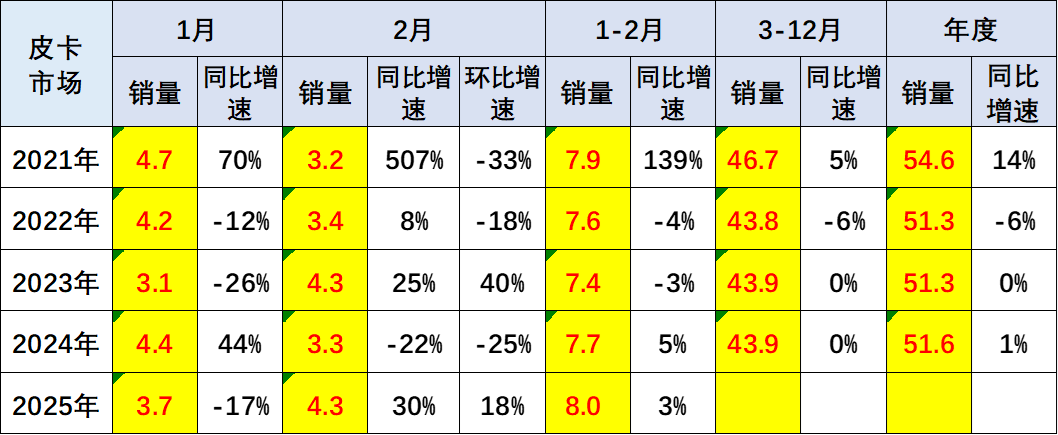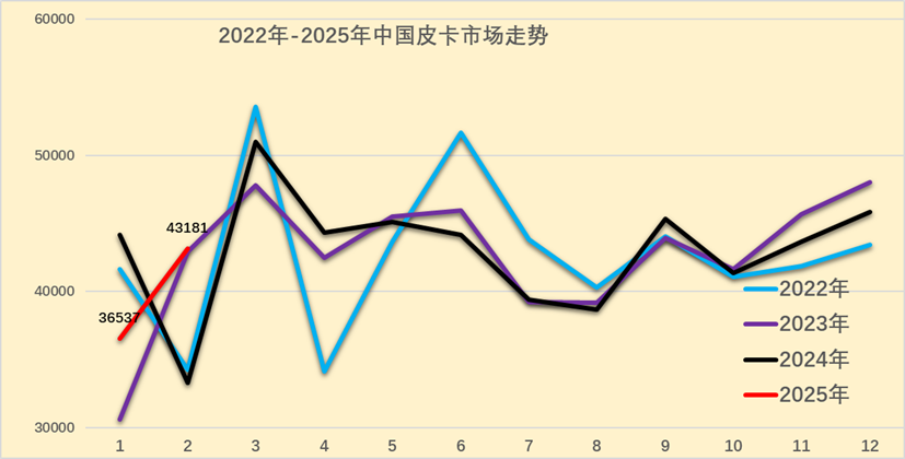 2025年2月份皮卡市场销售4.3万辆,同比增长30%,环比增长18%,处于近5年的高位水平。2025年1-2月份皮卡市场销售8万辆,同比增长3%。