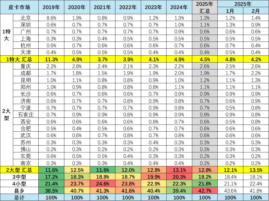 2025年2月全国皮卡主力城市是重庆、成都、乌鲁木齐、日喀则、昆明等西南和西北地区。北京、郑州等大城市需求有一定规模。随着电动皮卡推出,深圳近期表现较强。