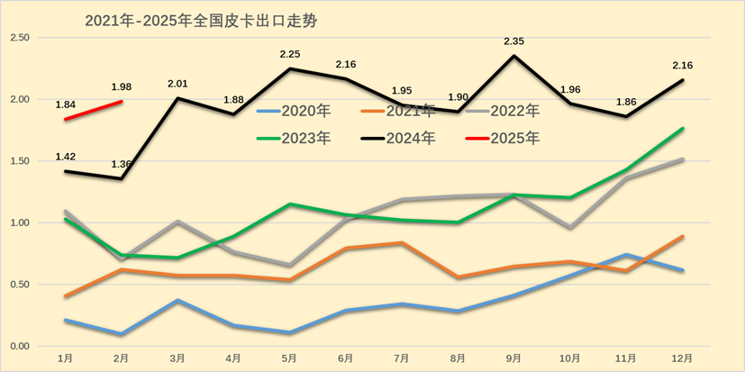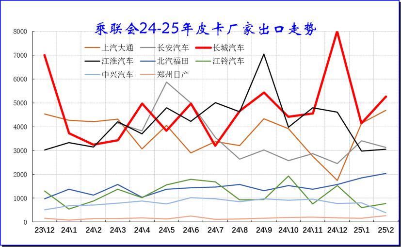 2025年2月的皮卡出口达到2.0万辆,环比增长8%,同比增长46%的增速较好,但仍低于正常月份出口。