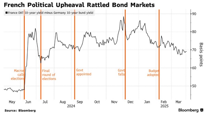 这一结果可谓为法国政府提供更好起点——其目标是将今年赤字规模降至预算赤字占比GDP的5.4%,并在2029年前符合欧盟规定的3%上限。但由于法国经济增长持续疲软,加上法国总统马克龙承诺提高国防开支(作为欧洲重整国防军备计划的一部分),这些目标面临日益严峻的挑战。