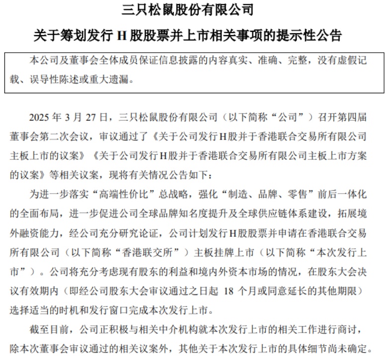 智通财经APP获悉,3月27日,三只松鼠(300783.SZ)公告称,公司计划发行H股股票并申请在香港联交所主板挂牌上市,以进一步落实“高端性价比”总战略,提升全球品牌知名度,建设全球供应链体系,并拓展境外融资能力。公司将充分考虑现有股东利益和境内外资本市场情况,在股东大会决议有效期内选择适当时机和发行窗口完成本次发行上市。目前,公司正积极与相关中介机构进行商讨,具体细节尚未确定。