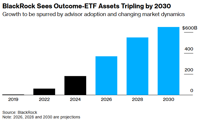 智通财经APP获悉,全球最大资管公司贝莱德正押注一场静悄悄的革命——衍生品驱动的"结果导向型ETF(Outcome ETFs)"正以惊人速度蚕食传统投资组合管理领地。根据最新白皮书,这类通过复杂金融工具实现预定投资目标的ETF,其资产规模到2030年将增长到三倍,达到6500亿美元,核心驱动力来自财务顾问普及化与人口结构变迁。