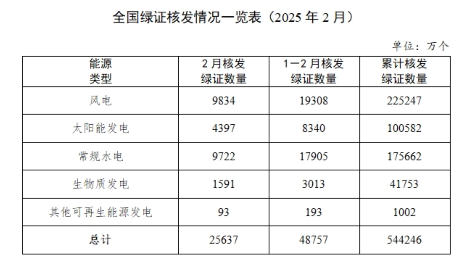 国家能源局发布2025年2月全国可再生能源绿色电力证书核发及交易数据