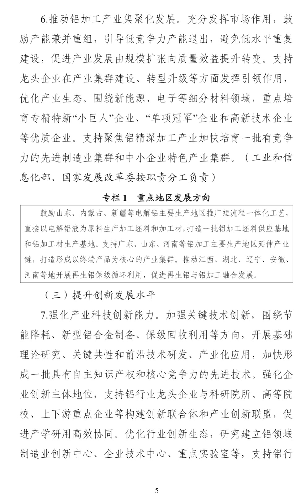 其中还提到,推动铝加工产业集聚化发展。充分发挥市场作用,鼓励产能兼并重组,引导低竞争力产能退出,避免低水平重复建设,促进产业发展由规模扩张向质量效益提升转变。支持龙头企业在产业集群建设、转型升级等方面发挥引领作用,优化产业生态。围绕新能源、电子等细分材料领域,重点培育专精特新“小巨人”企业、“单项冠军”企业和高新技术企业等优质企业。支持聚焦铝精深加工产业加快培育一批有竞争力的先进制造业集群和中小企业特色产业集群。