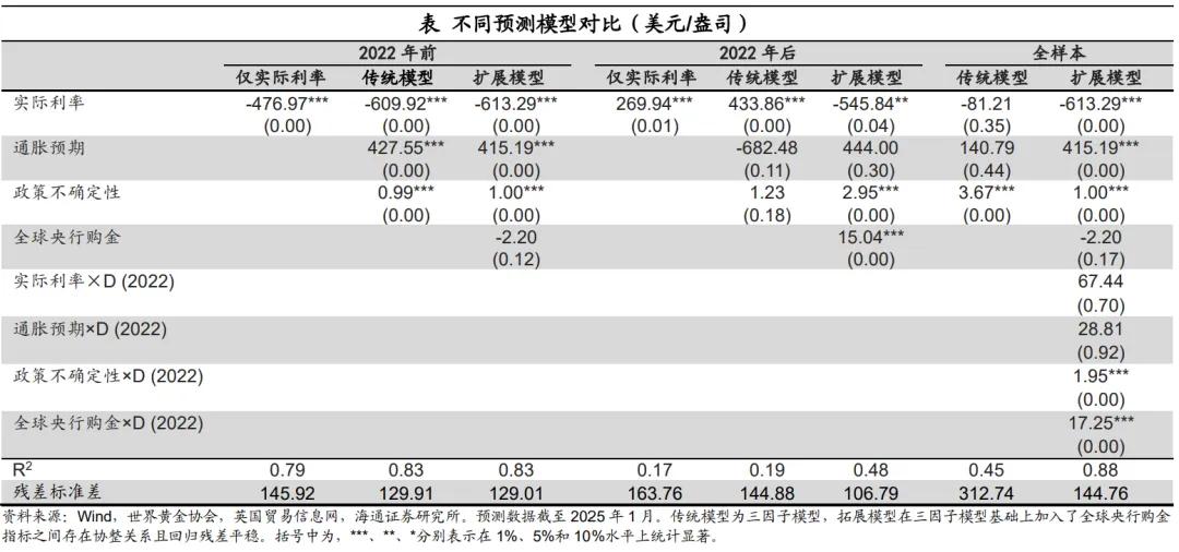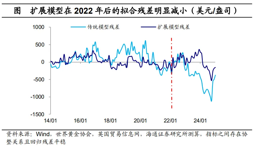 新的拓展模型对黄金价格走势的解释力度有显著提升。与传统模型相比,加入全球央行购金行为以及与虚拟变量交叉项的扩展模型对黄金价格的解释力度由此前的45%提升至了88%。另一方面,扩展模型的残差标准差从传统模型的313美元/盎司下降到了145美元/盎司,减小了近54%。