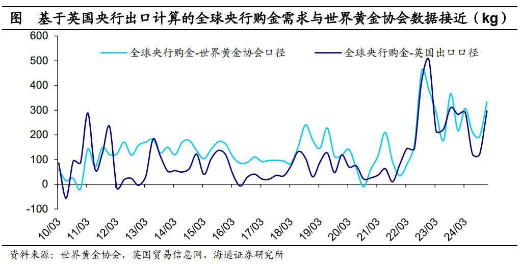 为了更准确及时地跟踪全球央行购金的真实情况,我们使用英国黄金出口数据(剔除出口到瑞士用于黄金加工的部分)作为全球央行购金的代理变量。这是因为英国伦敦场外交易中心以交易400盎司金条为主,这类金条因交易金额更大,单位成本更低,通常更受到全球央行或机构投资者青睐,而较少出口给零售消费者,因此可以作为全球央行购金的代理指标。