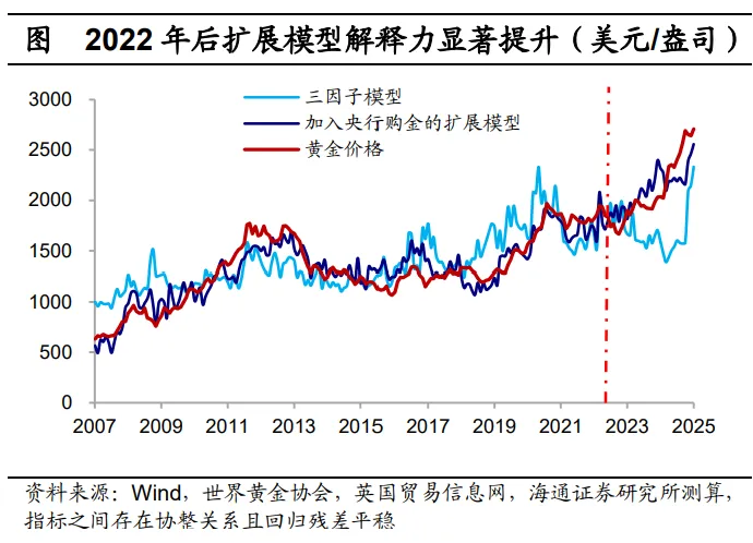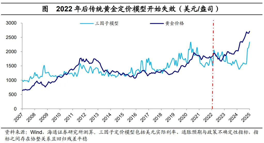 2022年后,三因子黄金定价模型逐渐失效。2022年以来,美元实际利率抬升至历史高位,黄金价格却不降反升,甚至屡创历史新高。三因子黄金定价模型的解释力度从2022年之前的83%回落至19%,已经无法刻画2022年以来金价的持续攀升。