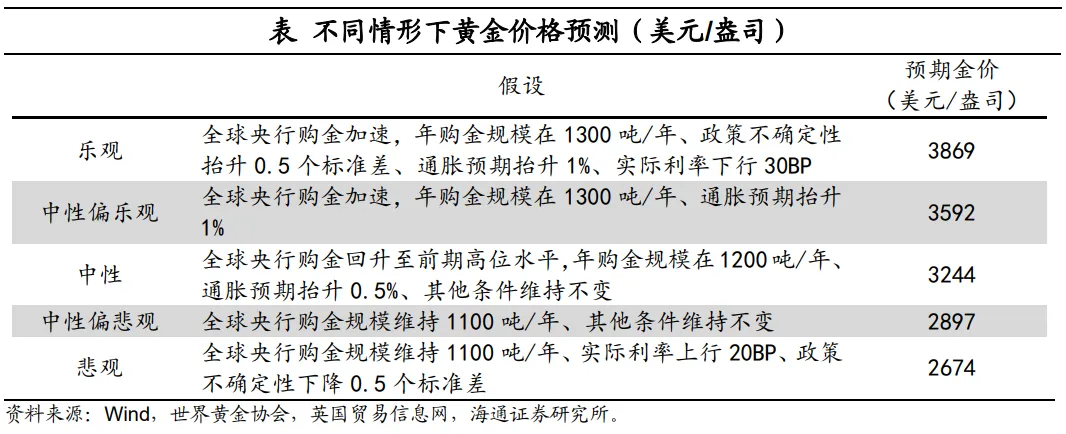 海通证券研报指出,乐观情形下,黄金价格或有望突破3800美元/盎司;中性情形下,黄金价格或达到3200美元/盎司左右;悲观情形下,黄金价格或回落至2600-2700美元/盎司的区间。