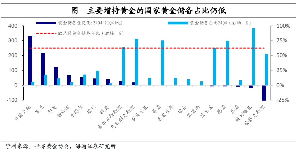 另一方面,目前主要购金国的官方黄金储备水平尚低,未来还有较大的增持空间。尽管过去三年中,中国、波兰、印度、新加坡、卡塔尔等央行购金规模位居全球央行前列,但其外汇储备中黄金占比仍处于较低水平,中国仅为5.5%,印度为11.4%。相比之下,欧元区黄金在外汇储备中的占比高达62.4%。因此,与欧洲的黄金储备水平相比,未来新兴市场国家黄金储备还有较大的增长空间。