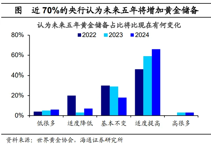 潜在制裁风险与美国债务高企将使得对美元的信任基础被削弱,在此情况下,全球货币体系重构所带来的全球央行购金需求增加将是长期的趋势。世界黄金协会2024年央行黄金储备调查问卷显示,69%的央行认为未来5年黄金储备将继续上升,这一比例自2022年以来呈持续上升趋势。
