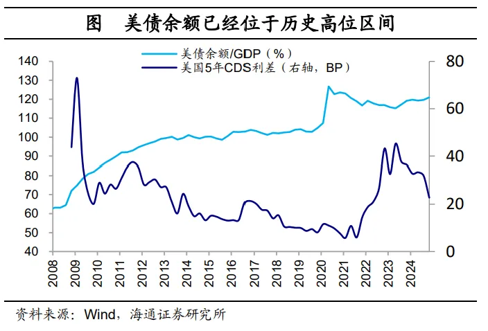 长期来看,我们认为黄金已经进入新的一轮长期牛市。各国之间信任度的下降,带来全球经济、货币体系的深度重构,这个过程将是长期的。一方面,全球央行购金需求增加或将是长期持续性的趋势。2022年俄罗斯外汇储备被冻结,使得各国央行对美国金融制裁的担忧上升。再加上美国债务规模持续攀升,赤字率的高企有趋于长期化的趋势,财政纪律的丧失也会加剧投资者对美国债务可持续性的担忧,美国5年期CDS利差目前也处于近年来的高位区间。