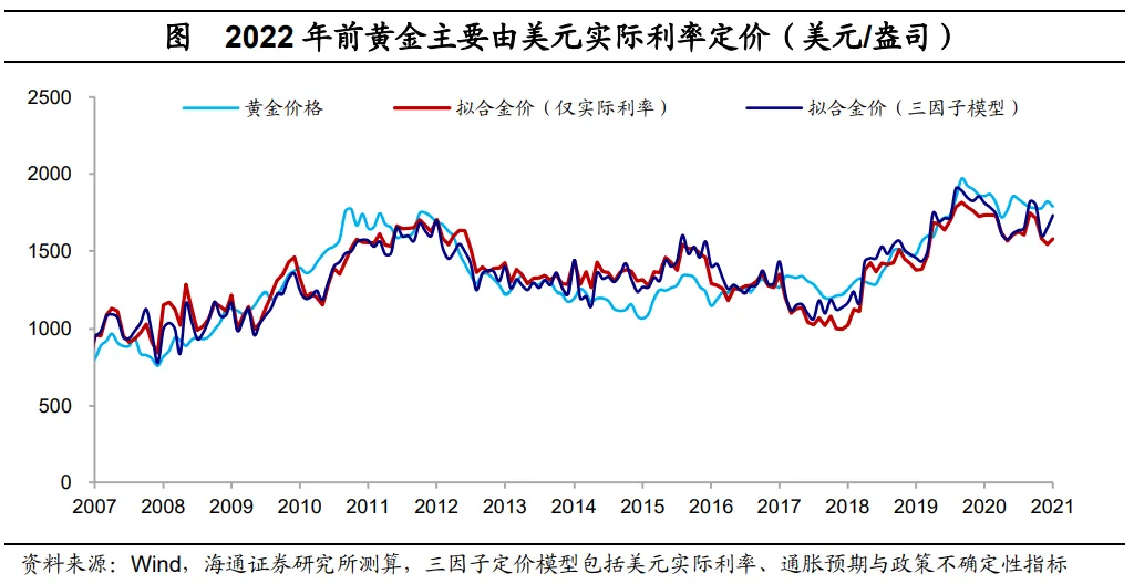 2022年之前,黄金价格主要是由美元实际利率定价。我们用美元实际利率和通胀预期来刻画金融属性、经济不确定性指数刻画避险属性,构建了黄金定价的三因子模型。从回归结果来看,2007-2022年期间,三因子对黄金价格均有显著影响,对黄金价格走势的解释力度达到83%。其中,仅实际利率一个因子便能解释78%的黄金价格波动,是主导黄金价格走势最关键的因素。相比之下,全球央行购金需求则在2007-2022年对黄金价格无显著影响。
