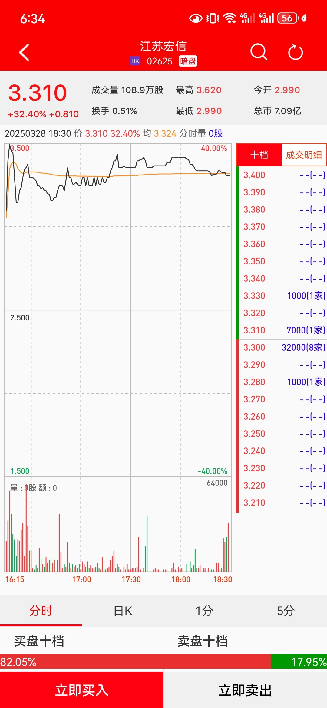 智通财经APP获悉,江苏宏信(02625)将于3月31日(星期一)在香港挂牌。截至收盘,利弗莫尔证券暗盘交易显示报价3.31港元,较招股价2.5港元上涨32.40%,每手1000股,不计手续费,每手赚810港元。