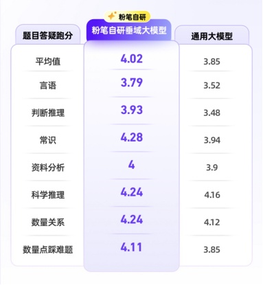 内部测评数据显示,在题目答疑场景,粉笔自研垂域大模型在言语、判断推理、常识、资料分析等科目中的跑分表现均优于DeepSeek等通用大模型,充分印证了其在公考培训领域的技术领先性与商业化能力。