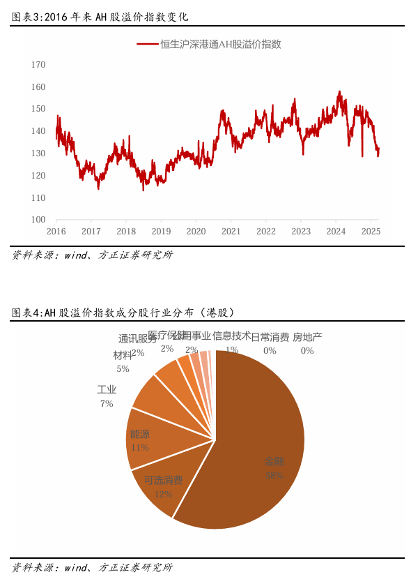 从最新AH股溢价指数成分股(港股)分布来看,金融板块市值占比高达58%,占据了绝对大头,可选消费占比仅为12%,通讯服务和信息技术占比分别仅为2%和1%。也就是说当前两地共同上市的AH股中多为金融等传统周期板块,而可选消费、通讯服务、信息技术等新兴板块两地共同上市的公司占比依然较小。