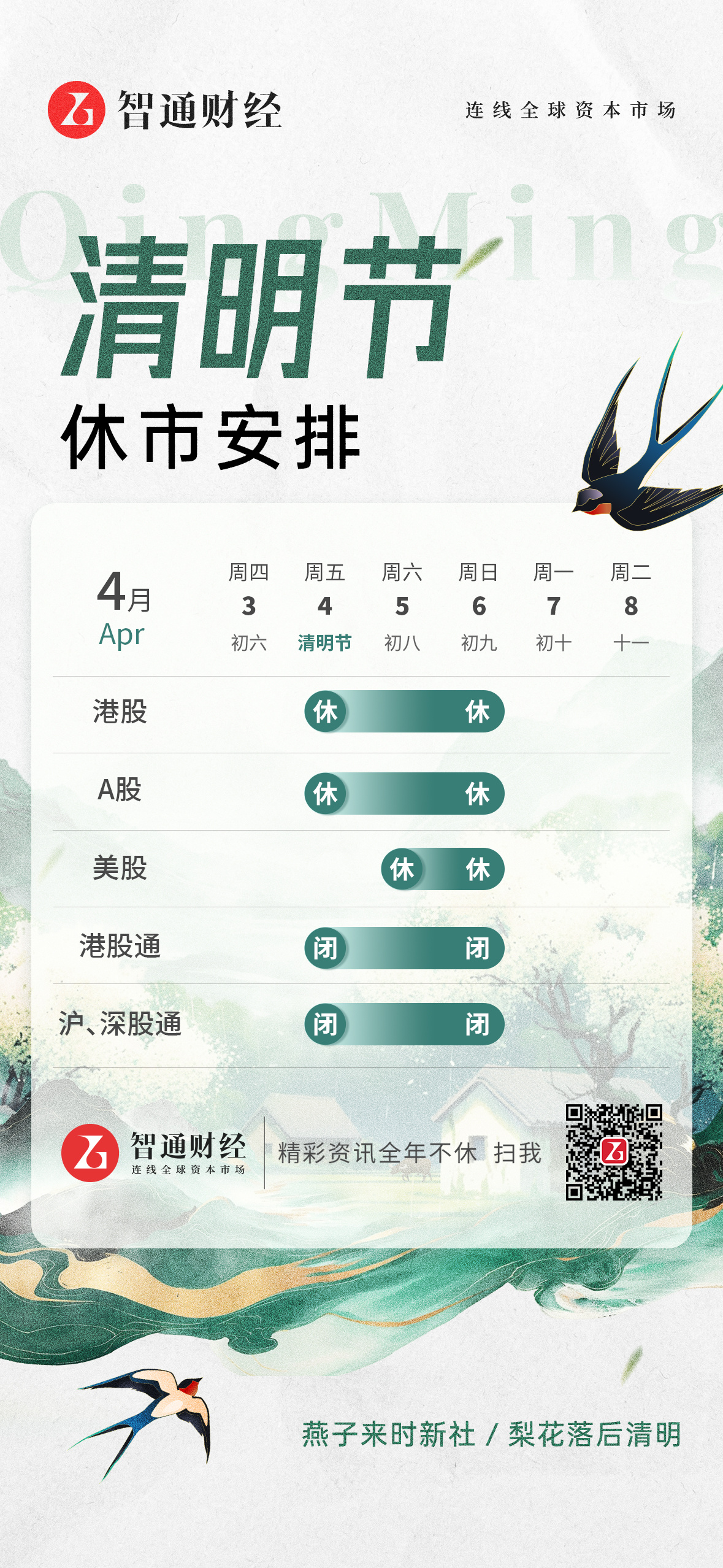 智通财经APP获悉,2025年清明假期即将来临,港股于4月4日(星期五)至4月6日(星期日)休市,4月7日(星期一)起照常开市。