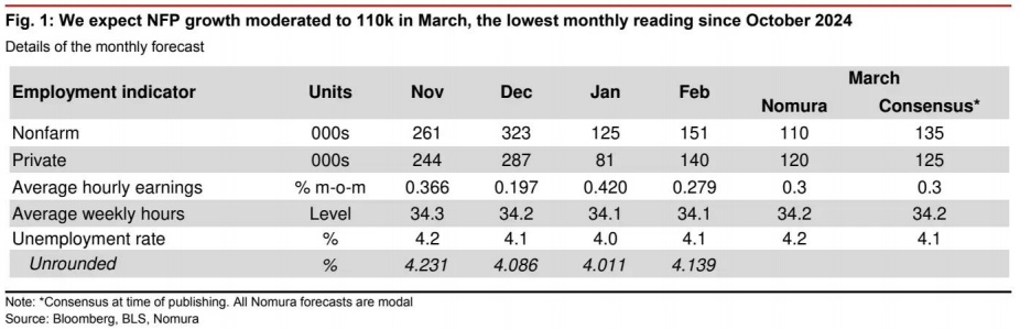 野村预计3月非农就业人数增长放缓至11.0万,这将是自2024年10月以来的最低月度读数,使3个月平均值略低于13.0万。