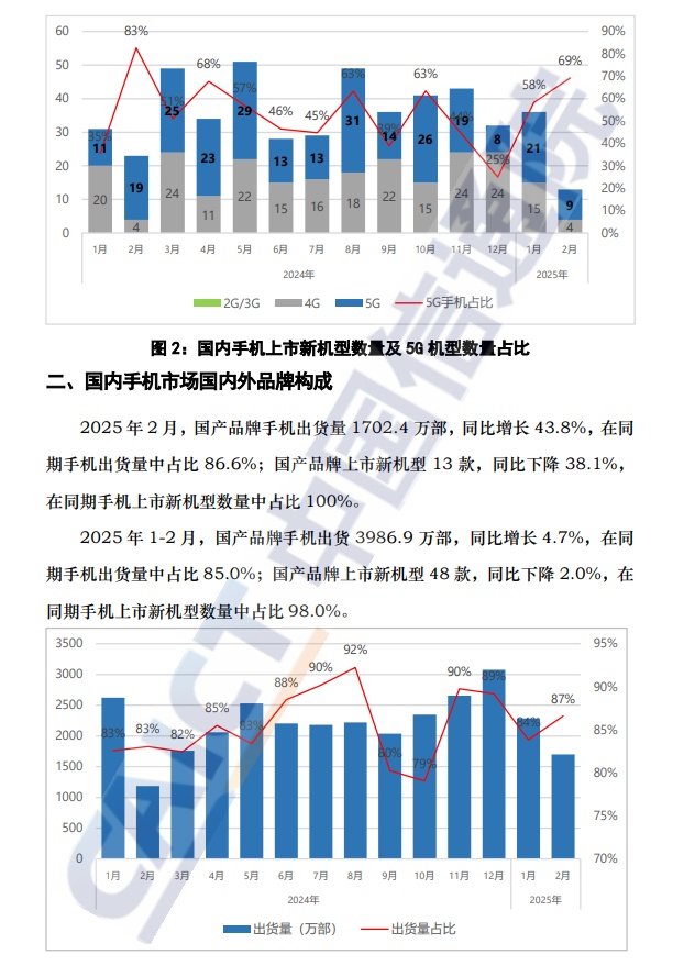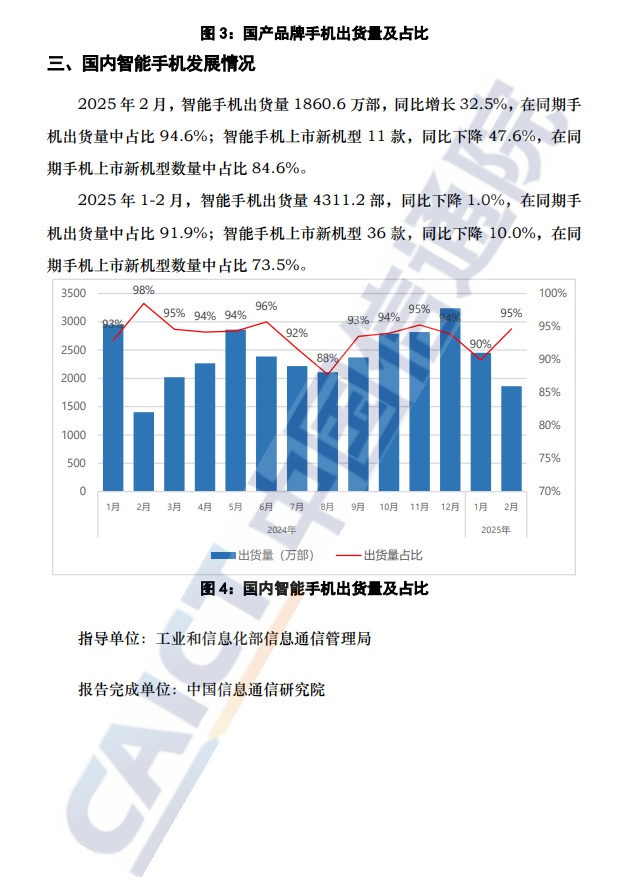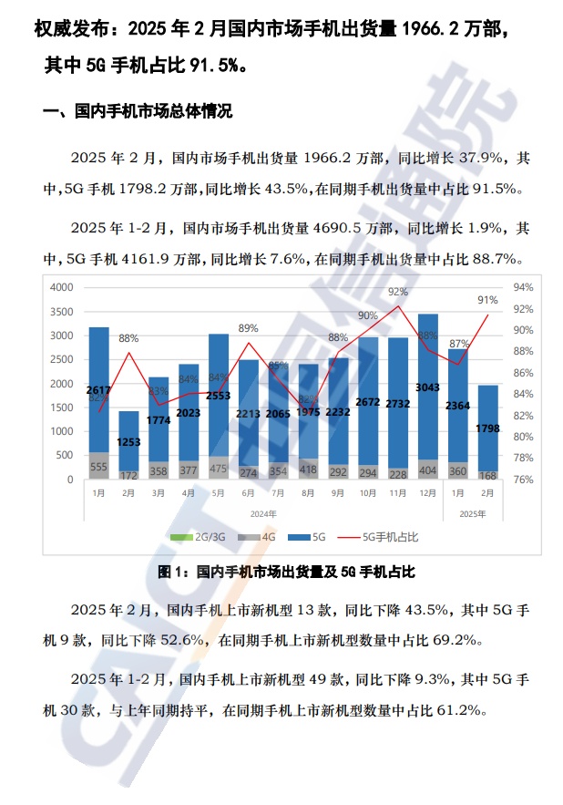 智通财经APP获悉,3月31日,据中国通信院,2025年2月,国内市场手机出货量1966.2万部,同比增长37.9%,其中,5G手机1798.2万部,同比增长43.5%,在同期手机出货量中占比91.5%。2025年1-2月,国内市场手机出货量4690.5万部,同比增长1.9%,其中,5G手机4161.9万部,同比增长7.6%,在同期手机出货量中占比88.7%。