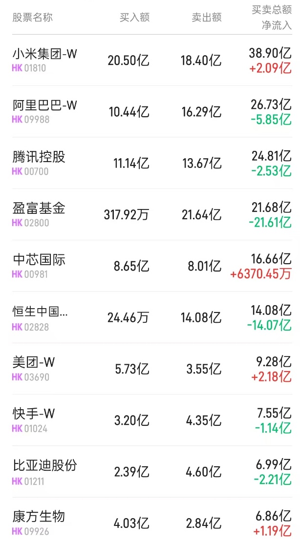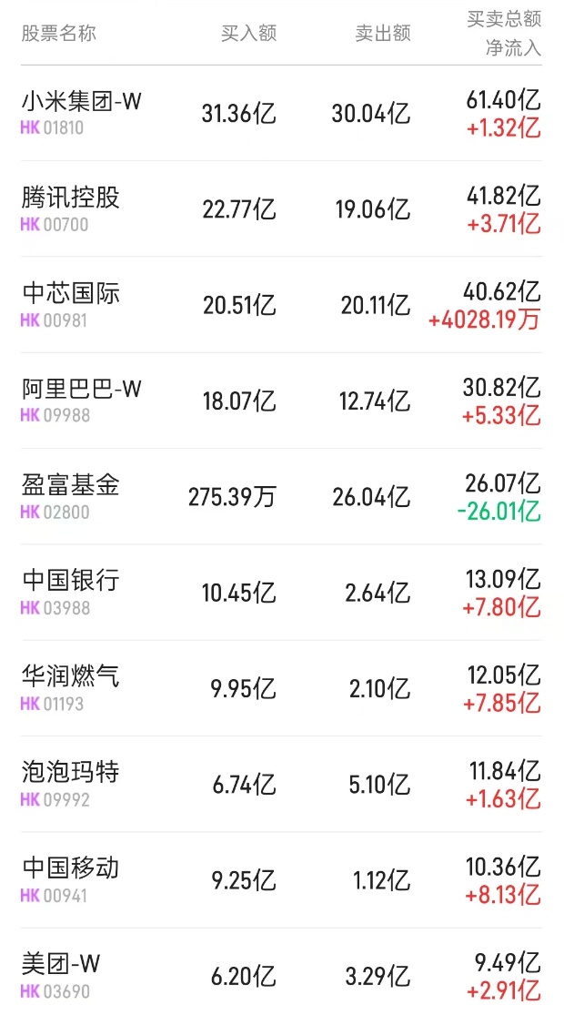 此外,美团-W(03690)、腾讯(00700)、中芯国际(00981)分别获净买入5.08亿、1.17亿、1.03亿港元。而阿里巴巴-W(09988)遭净卖出5141万港元。