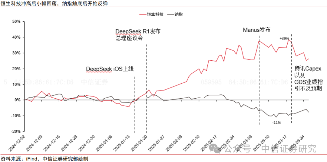 1月至今,中国科技资产估值持续回升,恒生科技指数年内最大涨幅达39%,后回落至25%,阿里、小米、中芯国际、比亚迪等港股科技公司股价上涨近60%。驱动恒生科技重估的事件包括:1)1月10日至1月15日前后,DeepSeek的APP依次在苹果iOS和安卓上线,且在全球下载量持续快速提升;2)1月20日DeepSeek发布R1,效果追平OpenAI o1,且全面开源;3)3月6日,Manus推出“通用”Agent产品等。此外,阿里在季报中提出的“三年3800亿CAPEX”亦引发资本市场想象。但后续,腾讯等公司的CAPEX低于市场上调后的乐观预期,万国数据等IDC公司业绩不达预期,导致投资人出现观望情绪。