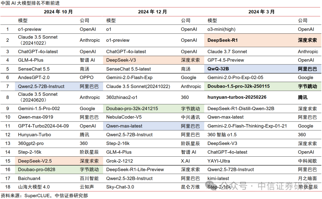 模型侧:DeepSeek带动整个中国AI生态的繁荣;其通过R1开源削弱OpenAI技术优势并拉动国内推理模型迭代的繁荣;通过开源六大代码库开放训练优化和硬件调教技术,推动全行业算力高效利用。最新的3月SuperCLUE榜单显示,DeepSeek-R1仅次于o3-mini,领先于Claude-3.7和GPT-4.5;阿里QwQ-32B、Doubao-1.5-pro等国产模型表现紧随其后。后续,新版V3、R2,以及豆包、千问等团队预计将继续在推理能力、多模态等方向迭代,持续维持中国大模型竞争地位、缩小中美差距,拉动推理算力、模型应用等产业的繁荣。