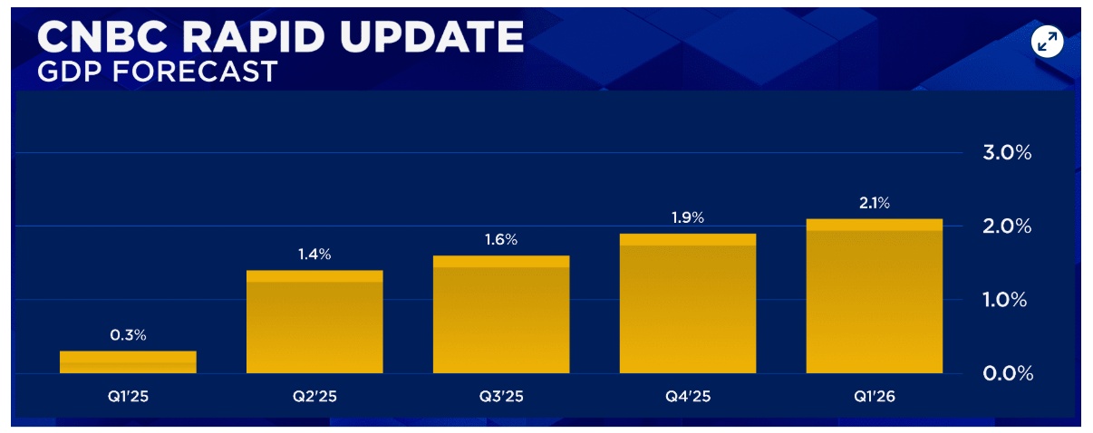 多数经济学家平均预测经济将逐步复苏:二季度GDP增速1.4%、三季度1.6%、四季度升至2%。但危险在于0.3%的微弱增长极易滑向负值区间。随着新关税本周落地,并非所有人都对反弹充满信心。