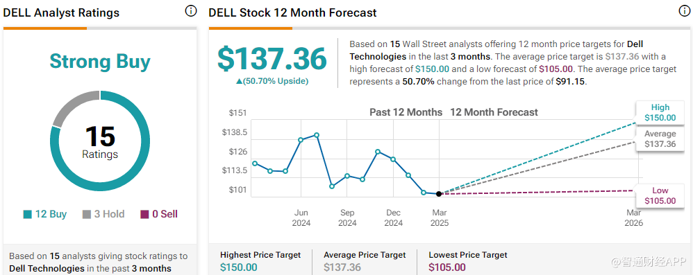 TipRanks数据显示,总体而言,华尔街分析师予戴尔科技“强力买入”评级,平均目标价为137.36美元,较当前股价水平高出51%。