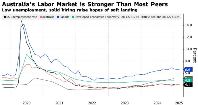 而就在澳洲联储维持利率不变之际,特朗普表示,可能会在4月1日晚上或者4月2日宣布关税细节。围绕特朗普关税计划的不确定性引发了人们的担忧,他们担心关税计划会扰乱供应链,提高价格。而且特朗普的关税计划变化莫测。即使澳大利亚避免受到直接影响,但作为一个小型开放经济体,它与全球经济活动和市场情绪密切相关,也可能会受到一些影响。布洛克重申,关税还没有对价格产生影响,对澳大利亚来说重要的是对中国等主要贸易伙伴的影响。她补充说,如果对大宗商品价格产生影响,汇率可能也会起到缓冲作用。