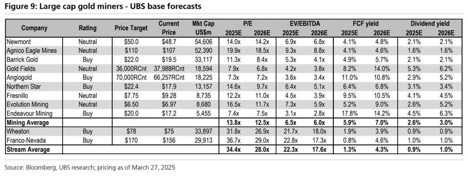 由于行业表现分化明显,黄金矿商的估值差距较大,瑞银将此视为机会,并倾向于选择一些“更便宜的复苏故事”。近期,该行已将伊格尔矿业(AEM.US)和金田(GFI.US)的评级下调至“中性”。而在全球大型矿商中,该行更偏好巴里克黄金(GOLD.US)、Northern Star,并认为在经历了艰难的2024年后,Endeavour将在2025年迎来良好表现。此外,该行继续青睐具备短期增长和分散化特征的矿区特许权使用费(Royalties)/矿物流权益(Streams)模式,并首选Franco-Nevada(FNV.US)。
