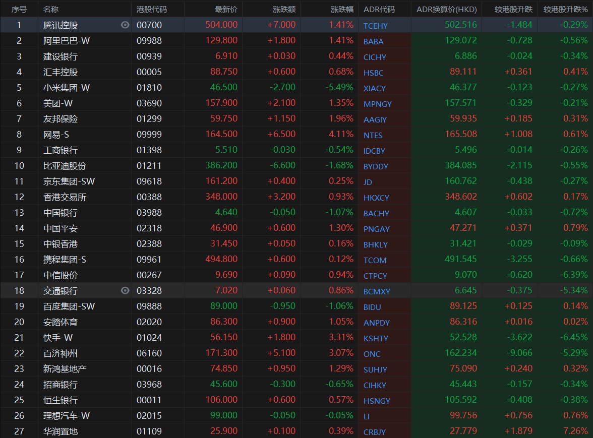 大型蓝筹股涨跌不一,汇丰控股收报89.111港元,较香港收市涨0.41%;腾讯控股收报502.516港元,较香港收市跌0.29%。