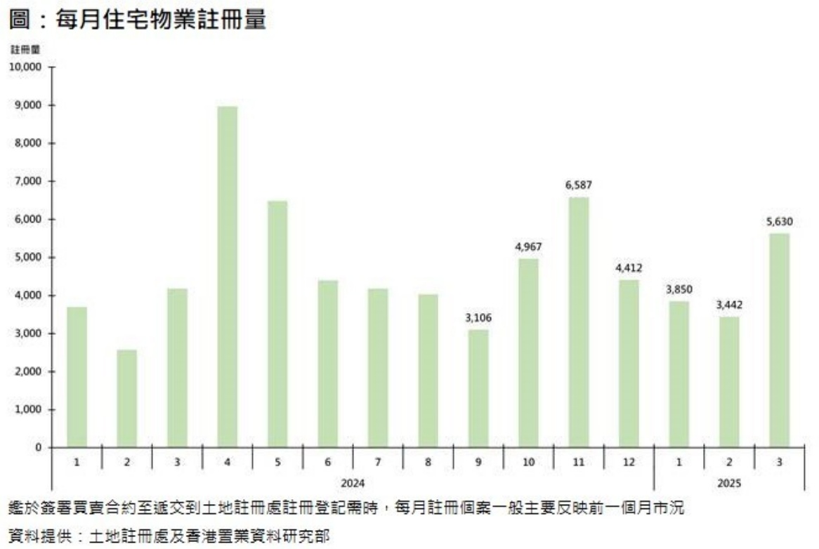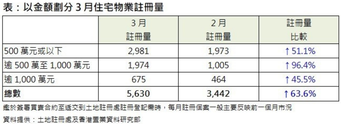 新春假期后楼市回暖,再加上2月末公布的《财政预算案》推出利好楼市措施,3月新盘销售火热,二手交投亦较好;值得留意,部分3月成交的一手个案赶在同月注册,带动3月住宅注册量录不俗升幅。