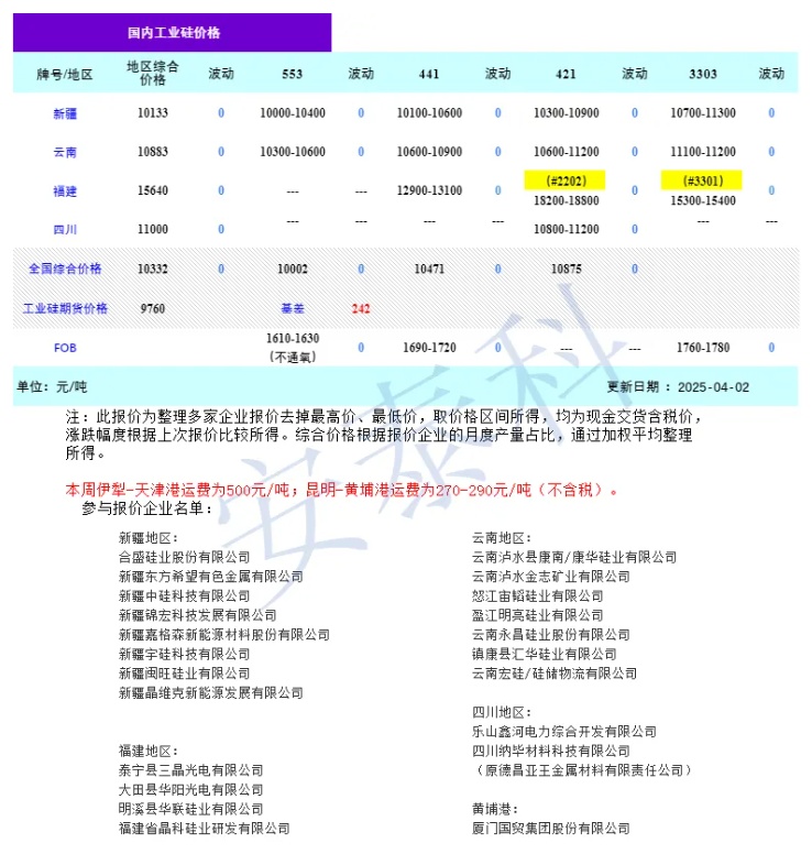 智通财经APP获悉,中国有色金属工业协会硅业分会发布工业硅周评称,本周工业硅现货价格持稳,全国综合价格和各地区综合价格持稳,FOB价格持稳。过去一周(2025年3月27日-4月2日),主力合约收盘价从9920元/吨震荡波动至9760元/吨,跌幅为1.61%。本周市场仍未有明显好转,北方大厂减产计划落地,期货合约价格小幅回调,但整体市场成交清淡,需求端仍以刚需采购为主,整体价格持稳。