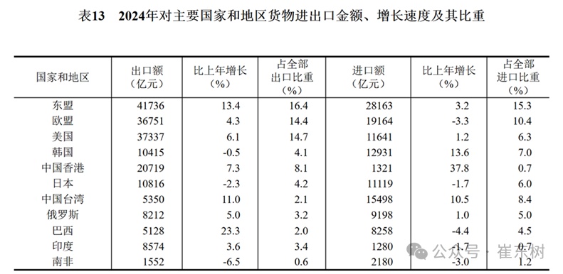 根据中华人民共和国2024年国民经济和社会发展统计公报,中国全年货物进出口总额438468亿元,比上年增长5.0%。其中,出口254545亿元,增长7.1%;进口183923亿元,增长2.3%。货物进出口顺差70623亿元。对共建“一带一路”国家进出口额220685亿元,比上年增长6.4%。其中,出口122095亿元,增长9.6%;进口98589亿元,增长2.7%。对《区域全面经济伙伴关系协定》(RCEP)其他成员国进出口额131645亿元,比上年增长4.5%。