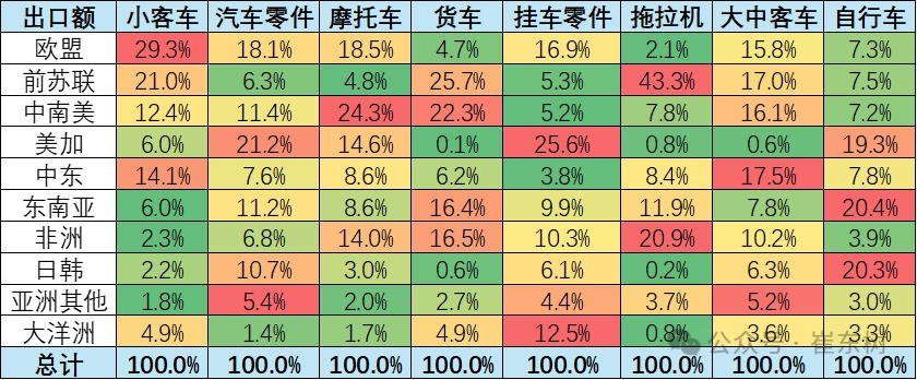像拖拉机等这些产品,我们对欧美日韩基本就出口量是极其微乎其微的,因为拖拉机跟坦克实际上是相类似的战略产品,在前期很多企业的拖拉机坦克是一体化生产的概念,而现在来看,拖拉机、坦克与汽车等,中国对发达国家出口都是比较小的。但是像自行车、摩托车,还有像我们其它汽车零部件这些市场化充分的民用产品,中国对欧美日韩的出口都表现比较优秀,汽车在这块是短板,但也是我们短期防风险能力的具体体现。