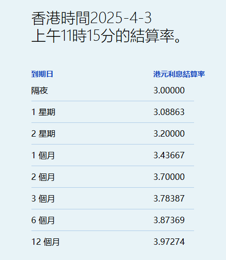 智通财经APP获悉,4月3日,美国总统特朗普正式签署“对等关税”行政令,开始全面对贸易伙伴征收关税,引发全球市场震动。港元汇率最低曾见7.7847兑1美元,为2月17日以来最低,港元拆息几乎全线走软,仅隔夜息结束两连跌,回升近12基点至3%。