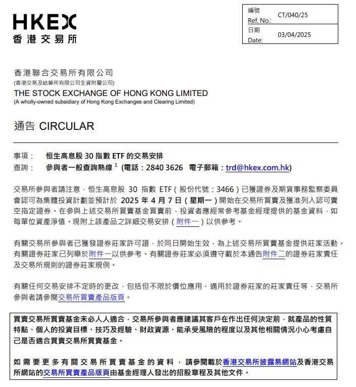 智通财经APP获悉,4月3日,港交所发文称,恒生高息股30指数ETF(股份代号:3466)已获香港证券及期货事务监察委员会认可为集体投资计划并预计于2025年4月7日(星期一)开始在交易所买卖及获准列入认可卖空指定证券。