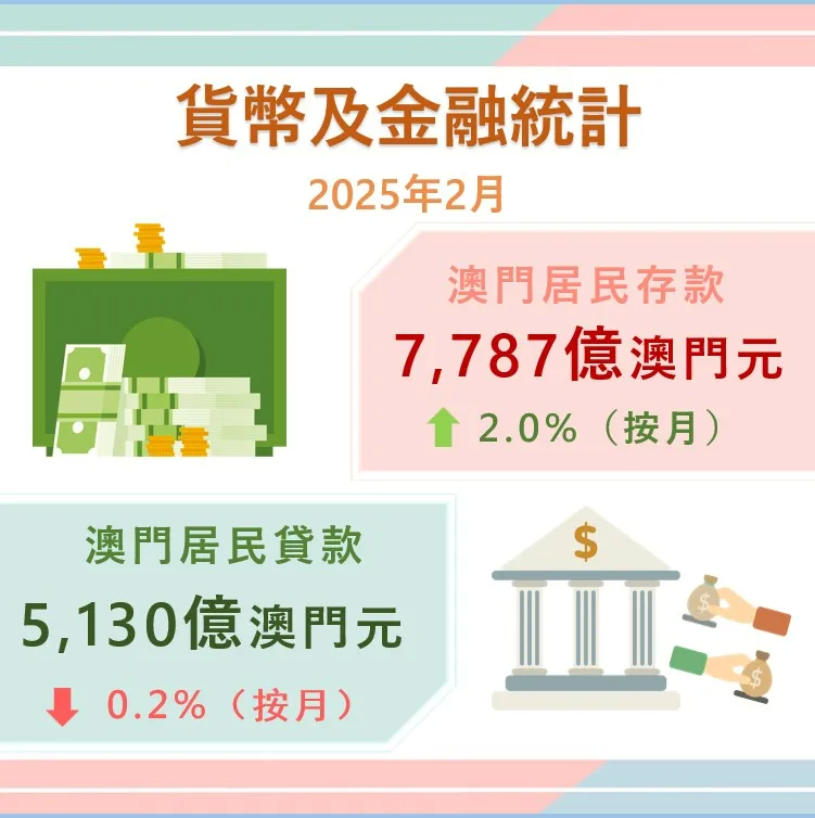 智通财经APP获悉,澳门金融管理局今日发布的统计显示,2025年2月的居民存款环比增加,居民贷款则录得跌幅。澳门居民存款达到7,787亿澳门元,环比增长2.0%;而澳门居民贷款为5,130亿澳门元,环比下降0.2%。