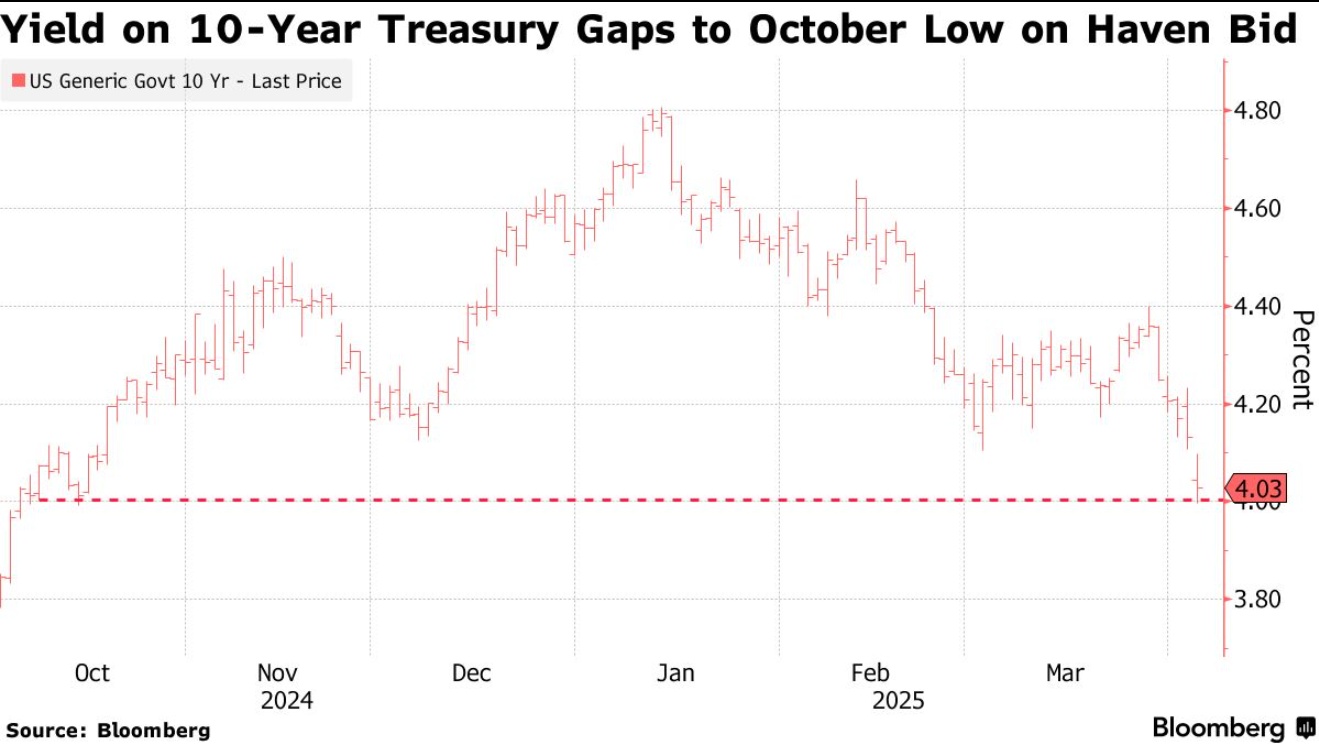 关税阴霾下,全球避险情绪急剧升温。周四十年期美债收益率一度跌破4%大关,创下大选以来的最低水平。市场对美联储降息的押注完全消化了6月降息25个基点的预期,交易员们正在疯狂争夺避险资产。然而,美联储官员的表态却暗藏玄机:尽管关税可能削弱企业与消费者信心,但强劲的就业市场和顽固的通胀压力,仍可能让美联储选择按兵不动。