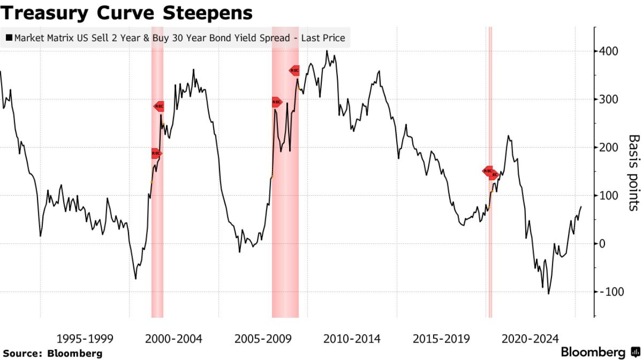 这种不断增长的市场押注已反映在收益率曲线上,周四,两年期与30年期债券收益率的差距扩大至75个基点,创下三年来的新高。