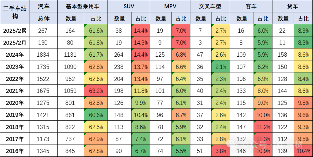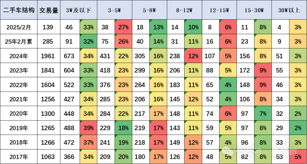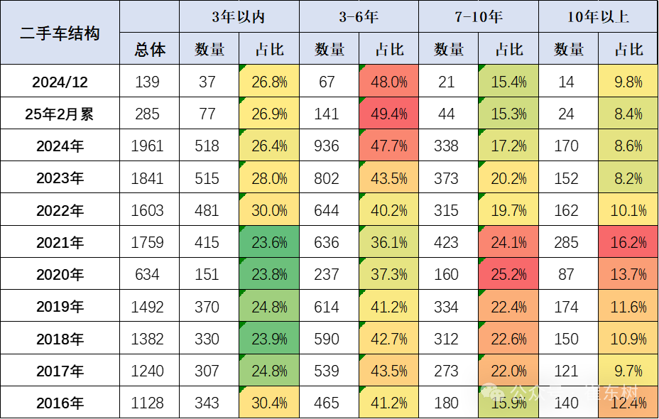 二手车的次新车交易表现较强,主要也是新能源车成为二手车的组成。二手车的交易结构目前来看:三年以内的二手车逐步减少,2025年1-2月总体占比达到26.9%的比例,而3-6年达到49.4%的比例,增长比较突出,两者比例都是相对较高的,也就是说,六年以内的二手车占到76%的比例,而7-10年的二手车,2025年1-2月仅占到15.3%的比例。10年以上的二手车2025年1-2月下降到8.4%。