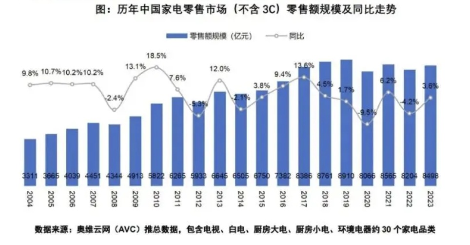 智通财经APP了解到,疫情三年给我国家电市场带来了极大冲击。随着疫情的放开,家电市场回暖的趋势并不显著,主要由于家电市场保有量较高、部分消费品类已变可选品类、消费频次较低、更新换代的需求不紧迫。数据显示,2023年我国家电市场规模达到8498亿元,恢复至疫情前零售规模的95.4%,同比增长3.6个百分点。可见在多方因素下,家电行业呈现出慢复苏趋势。