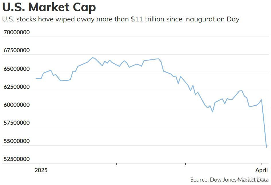 智通财经APP获悉,据道琼斯市场数据显示,自1月17日(特朗普总统宣誓就职、开启第二任期的前一个星期五)以来,美国股市已累计蒸发约11.1万亿美元市值。其中,仅过去的周四和周五两日,就损失了约6.6万亿美元,创下史上最大两日市值缩水纪录。